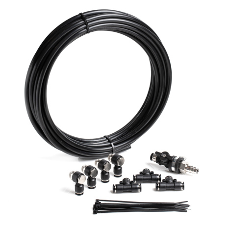 Inden for slangesættet får du 10 m (32,8 ft) 8 mm quick-connect pneufit slange, 3 gange quick-connect T-fittings, 4 x quick-connect 1/4 "BSPP fittings til Air Jack indløb og en petcock kugleventil. et lavtryks 8 BAR / 120 PSI opsætning og er ekstremt let, let at installere, holdbar og overkommelig. Når du køber et af Air Jack-sæt, er dette slangesæt inkluderet