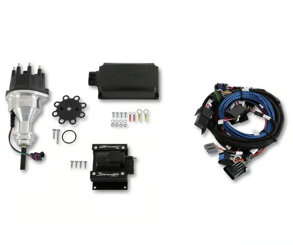 Holley Sniper EFI HyperSpark distributor kits were designed to make upgrading your ignition on a Sniper EFI-equipped engine simple. When installed concurrently with a new Sniper EFI system, the combination creates the easiest way to install EFI conversion on the market—and only four flying lead connections are required! The harness only requires one connection to a switched power source, battery positive, battery negative, and fuel pump power. The pre-terminated connectors and a built in 40A relay provides power to all of the components within the system. With the included Sniper EFI main harness you no longer need to run multiple wires to provide switched power for each individual component, which not only helps prevent wiring confusion, but it will also speed up your install time and clean up your engine bay. Simply route the harness and pre-terminated connectors to your HyperSpark coil, distributor, and ignition box and plug them in. Available for all popular engine combinations, these kits come with a distributor, coil, ignition box, and an integrated Sniper EFI harness. Order the application you need.
